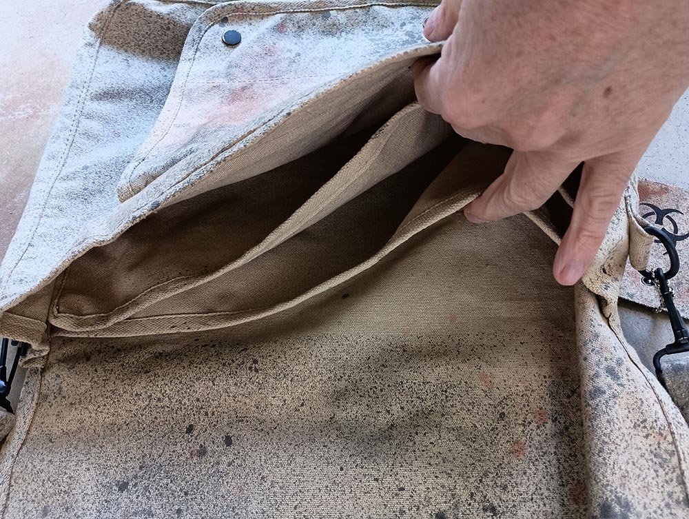 - The main compartment is split into 3 slots, with an additional snap pocket sewn onto the front.